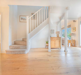 Upon entering the property, you are greeted by an expansive and light-filled entrance HALLWAY, where engineered oak flooring immediately adds warmth and quality. This welcoming space benefits from multiple built-in storage cupboards, ideal for busy family life, along with two front-aspect windows and double doors opening to the rear of the house, drawing the eye through to the garden and swimming pool beyond. A door leads down to the cellar, which also houses a sauna, offering a wonderful retreat at the end of a long day spent outdoors.