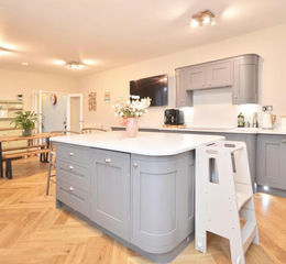 Kitchen/Breakfast Room - 4.28 x 8.14 (14'0" x 26'8") - Double glazed windows to front aspect, stable style door to front aspect, wood flooring, 3 radiators, a range of mainly floor units with Quartz work surfaces over, 1 1/2 bowl Villeroy and Boch sink unit with mixer taps over, Bosch induction hob with extractor hood and Quartz splash back, under unit lighting, large central island with Quartz work surface over and ample storage beneath, integrated full sized dishwasher, area for bar stools, space and plumbing for American style fridge freezer, separate area with further storage space, opening for microwave and double oven/grill and warming drawer, door to