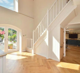 Hallway - 4.31 x3.49 (14'1" x11'5") - Wood flooring, stairs rising to first floor landing, vaulted ceilings with window and Velux allowing plenty of light, inset spots, exposed wooden beams, understairs storage cupboard, contemporary radiator, glazed double doors to