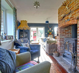 Entering the home, into a welcoming entrance hall, which houses the staircase to the first floor and offers useful storage space. To the right is a large sitting room, currently used as a home office, featuring a working log burner. The heart of the home is an open-plan kitchen, dining, and family area, which flows seamlessly into a cosy sitting space and an additional home office area. The kitchen is fully fitted, complete with a double oven, butler sink, and a handy larder. The dining and family areas are filled with natural light, with three sets of glass French doors providing access to the rear terrace and beyond. A charming log burner set within an exposed brick fireplace adds to the warm, country home atmosphere. Off the kitchen, there is a generous utility room with an adjoining cloakroom.