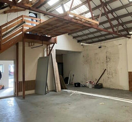storey height at the front with a flat roof. Behind that is a workshop with a steel truss roof with lined corrugated asbestos covering incorporating roof lights. Property sits back from the road behind a concrete forecourt allowing parking for two vehicles and space for