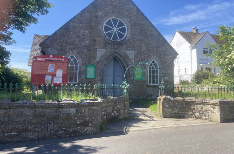 To the front of the property is low granite wall with rough iron railings above, including central pedestrian gate (no vehicle access), white concrete path leads to the double timber entrance doors, small grass areas to either side and the footpath continues around the east elevation to the ramp access leading to the side door into the Sunday School room. Further grass strip extends beyond the east side of the Sunday School and is approximately 1.45 metres. Grassed area continues to the rear, where the boundaries marked by a bonded stone wall are 1 metre high. At the rear of Madron Methodist Church is a further area, situated within this area is a PVC oil tank, set within galvanized steel mesh. On the east side of the boundary of the property, is enclosed by a very low stone wall with evidence of former iron railings, which have long been removed