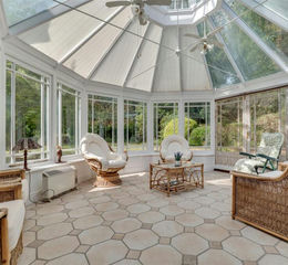Garden Room - 5.56m x 4.37m (18'3 x 14'4) - Lantern roof light, sealed unit double glazed windows, ceramic tiled floor, two fan light units and glass roof.