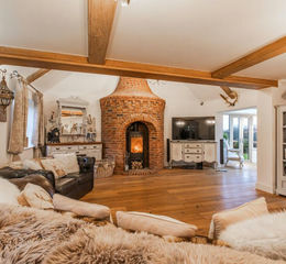 A magnificent sitting room provides a further highlight, defined by its vaulted ceiling and an individually crafted fireplace which anchors the space and lends a strong architectural presence. This room offers an inviting retreat while maintaining a sense of volume and drama. To the front of the house, a refined orangery introduces an additional reception space, flooded with natural light and enjoying open views across the grounds towards the neighbouring village church, a particularly attractive and characterful outlook.