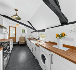 Matching range of wall and base units. Twin Belfast sink unit. Butchers block work surfaces. Range style cooker with stainless steel extractor cooker hood above. Plumbing for washing machine. Integrated dishwasher. Ideal combination gas boiler supplying hot water and central heating. Window to rear overlooking garden. Radiator. Door providing access to rear garden.