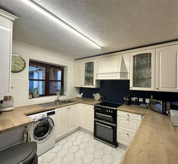 A well-arranged kitchen fitted with a range of wall and base units with complementary work surfaces and an inset one-and-a-half bowl sink with mixer tap. There is space for a cooker with extractor above, plumbing for a washing machine and dishwasher, and space for an under-counter refrigerator. A useful pantry provides additional storage, while a peninsula worktop subtly divides the space and leads through to the adjoining snug.