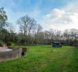 Paved patio area with steps leading down to the extensive rear garden mainly laid to lawn with surrounding mature shrubs and trees. Leading to the copse at the rear of the garden.