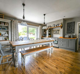 A beautifully presented and highly versatile home offering spacious accommodation and an exceptional lifestyle setup. The property opens into a bright entrance hall with attractive wooden staircase, leading to a flexible front reception room ideal as a study or additional bedroom. To the rear is a generous principal ground floor bedroom with garden views, walk-in wardrobe and contemporary en-suite shower room. The home also benefits from a cosy lounge with log burner and bespoke built-in storage, while the heart of the property is the well-appointed kitchen with Rangemaster cooker, integrated appliances and ample dining space, opening into a further living room with a second wood burner and patio doors to the garden. Additional features include a utility room, downstairs WC and garden access. Upstairs are two further double bedrooms and a stylish family bathroom. Outside, the impressive garden offers multiple patio areas with feature lighting, ideal for entertaining, alongside a fantastic range of outbuildings including stables, storage units, a fully equipped gym and a summer house/outdoor snug.