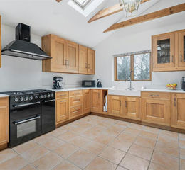 At the heart of the home is the impressive central dining room, beautifully illuminated by oak-framed, floor-to-ceiling glazing set within the original coach door opening, creating a bright and welcoming space. The adjoining kitchen/diner showcases a striking vaulted ceiling and a recently refurbished hand-made oak kitchen with a comprehensive range of eye- and base-level units. The kitchen is fitted with a corian sink and drainer, brand new integrated appliances, and elegant quartz work surfaces and splashback. A breakfast bar with seating overlooks the countryside views from the kitchen window, while double doors open directly onto a paved terrace, ideal for al fresco dining.