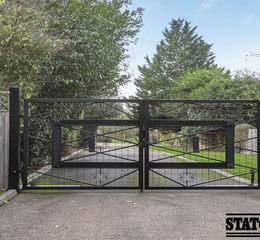 Hidden entirely from the road, the property is approached through secure gates and along an elegant, sweeping driveway that unfolds toward an imposing, perfectly symmetrical Georgian-style home. The sense of arrival is extraordinary.