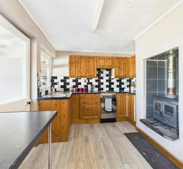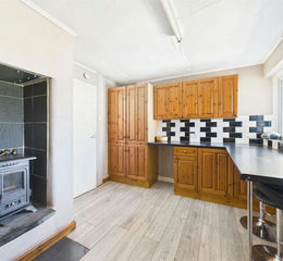 Fitted range of base and wall mounted cupboards with work surfaces incorporating stainless steel sink unit with drainer, space for cooker, breakfast bar. Wood burner.