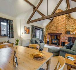 This impressive room has a high, vaulted ceiling with exposed timbers and a full height exposed brick and flint chimney breast to one wall, A fireplace houses a woodburning stove on a raised pamment hearth and has a bressummer beam over. Windows to two aspects overlook the courtyard and rear garden, with glazed double doors opening out to the courtyard and a large picture window framing the rear garden.