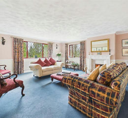 Living Room - 5.74m x 5.47m (18'9" x 17'11") - A superb principal reception room of exceptional proportions, the living room offers an elegant and inviting space ideal for both relaxation and entertaining. Beautifully presented, the room features a charming fireplace forming a central focal point, complemented by soft neutral décor and a generous arrangement of windows that flood the space with natural light. The impressive size of the room allows for multiple seating areas, creating a wonderfully versatile environment perfectly suited to modern family living.