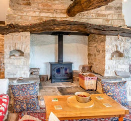 - featuring exposed beams, stone walls and a stone inglenook fireplace with wood burning stove
