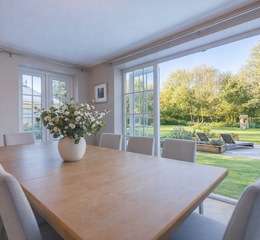 To the left is a serene sitting room with log burner, bespoke Kettle Design furnishings and newly laid oak wood flooring. This versatile room works equally well as a cosy winter retreat or, during warmer months, flows effortlessly into the conservatory and out to the expansive terrace beyond.
