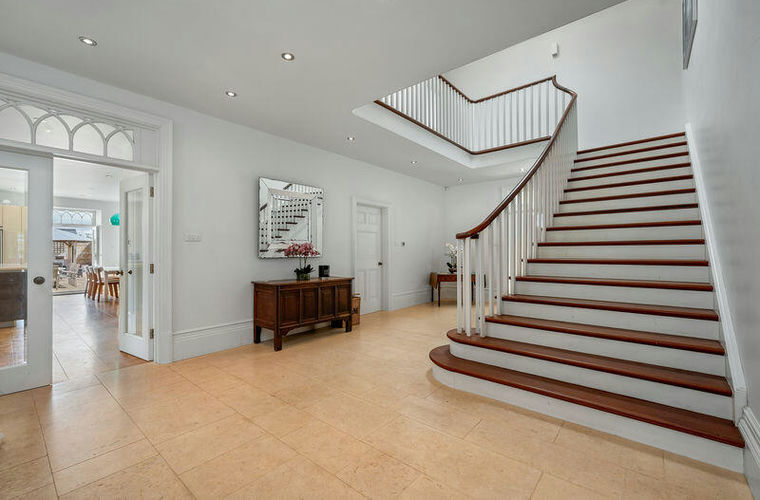 Arrival is via an elegant porch finished in limestone, leading into a welcoming central hall. A discreet boot room and cloakroom are positioned to one side, while the main hall opens dramatically beneath a galleried rooflight flooding the hall with natural light year round. A sweeping staircase rises through the space, forming a striking architectural feature and filling the centre of the home with daylight.