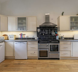 The double aspect Dining Room showcases the original features from the properties time as a dairy. Exposed timber and ironwork frame the vaulted ceiling. A cosy sitting area under the deep window ledge enhances this fantastic entertaining space.