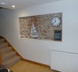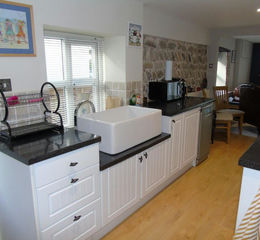 Side entrance. Laminate flooring. Open stone feature panel in the wall. Fitted white units with black metal handles to both all and floor to include 3 wall, 6 base, 3 draw. Black melamine worktop integrated electric oven, hob and extractor fan. Plumbing for the dishwasher and room for a fridge freezer. White porcelain Belfast sink with chrome mixer tap. Radiator.