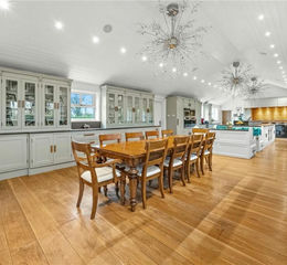 The farmhouse is anchored by a remarkable 68-foot kitchen, formed as three interconnected spaces and linked to the original house by a two-storey glazed structure completed in 2020. This central space connects to three substantial reception rooms, including a family sitting room, cinema/games room and walnut-panelled library. The upper floors provide six double bedrooms and contemporary bathrooms, including an exceptional principal suite with dressing area and circular marble wet room.