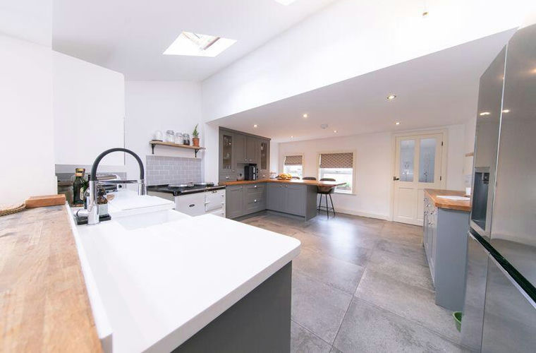 STUNNING and spacious kitchen comprising range of base level and tall units with solid wood and Corian work surfaces and breakfast bar and porcelain flooring. Featuring gas powered Aga, Belfast sink with mixer tap and American style fridge freezer. Dishwasher. Open to rear living and dining space with uPVC double-glazed windows to front aspect.