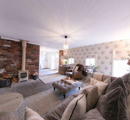 Open plan living and dining space, open to kitchen with feature roof lantern and double doors to garden. Doorways to washroom and utilities space and ground floor bedroom.