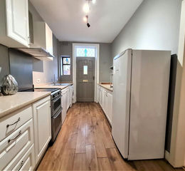 The ground floor comprises a galley-style kitchen fitted with a range of wall and base units, work surfaces and cooking facilities, with space for additional appliances. A rear door leads directly out to the patio and off-road parking area, offering practical day-to-day access. Also on this level is a separate dining room with fitted cupboards, ideal for family meals, along with a separate lounge providing a comfortable living space.
