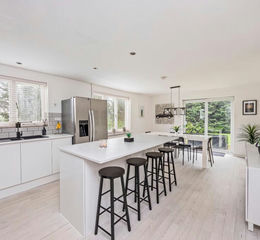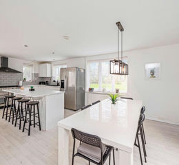 Set behind a generous gravel private driveway with ample parking, the property immediately impresses with its characterful brick façade and leafy surroundings. Inside, the home opens into a beautifully presented open-plan kitchen and dining space, the true heart of the house. Designed with both everyday living and entertaining in mind, the contemporary kitchen features sleek cabinetry, a central island with breakfast seating, and an abundance of natural light from wide windows and sliding doors that lead directly onto the garden. It’s a space that feels effortlessly sociable and welcoming.