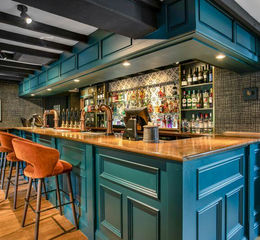 Timber topped and painted panel fronted with down lights. Bottle chillers, electronic cash registers. Bespoke tiled back bar fitting. Range of beer fonts including feature brass font with 4 hand pulls.