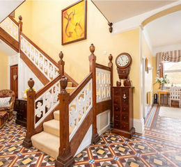 The main entrance door opens into an extensive hallway with original Victorian mosaic pattern floor tiles in the Victorian colour palette of buff, beige, blue, red and black. There is a downstairs shower room off this hallway which has an enclosed shower cubicle, a vanity wash basin and a WC, and a door to the cellar. All the reception rooms are accessed from this hallway, which also includes an area which is used for working from home and has floor to ceiling bookcases. An oak staircase leads to the first floor.