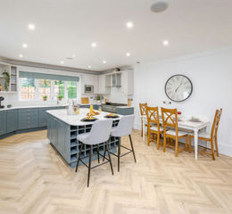 At the heart of the home lies a spacious open-plan kitchen with a large central island, perfect for family life and entertaining. This flows into a welcoming family room with a fireplace and double doors leading out to the terrace.