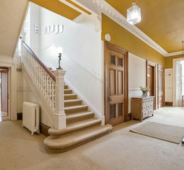 Stepping inside is a moment to savour. The grand reception hallway, crowned by a sweeping staircase with its original wooden balustrade, sets a tone of quiet grandeur and welcome. Light filters softly through tall windows, illuminating generous proportions and elegant sightlines.