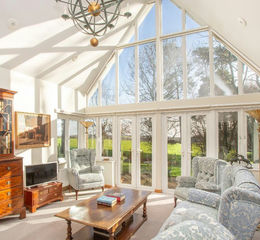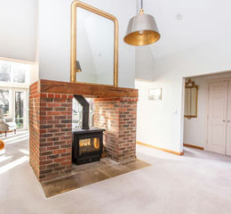 NO CHAIN - This architect designed house lies within private SOUTH FACING gardens of about 1 ACRE with VIEWS across the adjoining farmland. Built by a very respected local builder in 2000, the house has potential for an INTEGRAL ANNEXE or separate accommodation from the main house. A stunning atrium entrance hall has a central fireplace with a wood burning stove, open on both sides of the room, through to the drawing room. An entire wall up to the vaulted ceiling, is double glazed (fitted with high quality, electric German blinds) bringing the view over the garden and the adjoining countryside into the room.