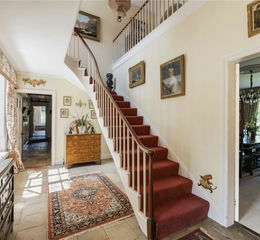 Upon entering through the stone porch, you are welcomed into a grand entrance hall featuring impressive ceiling height, a striking sweeping wooden staircase, and stone flooring—all of which set the tone for the elegance and character that define this home.