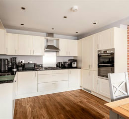 The ground floor is centred around a welcoming entrance hall with cloakroom, leading through to a beautifully proportioned 19ft kitchen/dining room. A large south-east facing bay window draws in excellent natural light, creating a sociable everyday space. The kitchen is fitted with contemporary high gloss cabinetry, granite worktops and a full range of integrated appliances, with the fridge freezer, dishwasher and washing machine all replaced within the last two years. Amtico flooring runs throughout the ground floor, and fibre broadband has been installed.