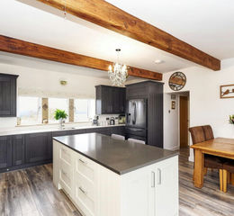 A superb open-plan kitchen with laminate flooring and a mix of base, low-level and high-level units in contrasting finishes. A large central island provides additional storage and seating. Appliances include a freestanding gas range oven, integrated microwave and dishwasher, with space for an American-style fridge freezer. An inset sink completes the layout. There is ample space for dining, with patio doors and a further rear-facing double glazed window allowing in natural light.