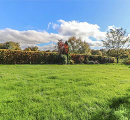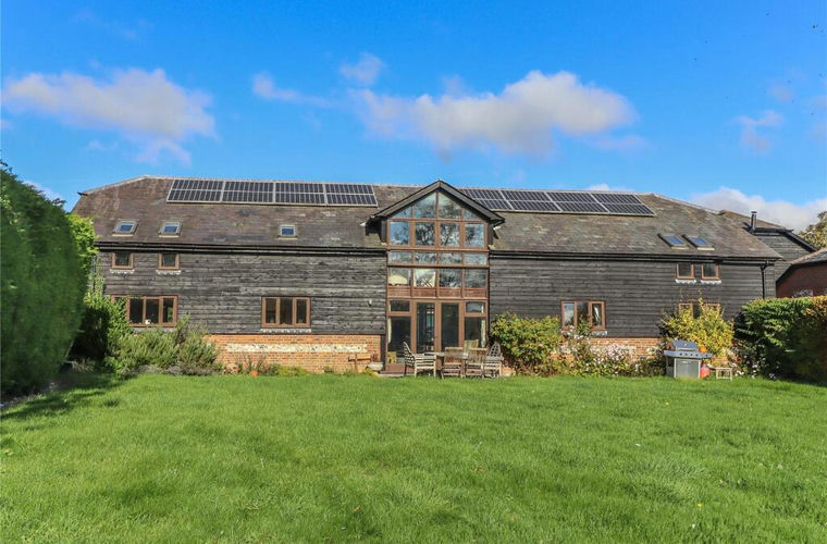 The Barn is set to the rear of a small courtyard development in the heart of the village, offering privacy and security while being tucked away from the road. The front of the property faces north and provides parking and access, allowing the majority of the third of an acre plot at the rear where it enjoys a delightful southerly aspect, excellent privacy and attractive views over adjoining meadows. Constructed with timber clad elevations above exposed brick and flint plinths beneath a slate roof, the property features large windows that allow in excellent natural light. Extending to an impressive 3,285 sq ft (3,594 sq ft including the attached double garage), the versatile accommodation centres around a spacious reception and dining hall with full height glazing to both front and rear, a breakfast room leading to a large farmhouse style kitchen and a separate utility room which links to the garage. A separate ground floor wing contains three double bedrooms and a family bathroom, with potential to create two bath/shower rooms if desired, while a cloakroom and large study, or potentially a fifth double bedroom, complete the ground floor. The first floor, with its high vaulted ceilings and exposed timber framework, is divided into two impressive spaces: a superb triple aspect drawing room with a striking apex window overlooking the garden and a substantial principal bedroom suite with sitting area and en suite bathroom. Now offering scope for updating, the property presents an excellent opportunity to be styled to a new owner's taste, complemented by a large south facing garden enjoying wonderful views over meadows and convenient access to Grateley mainline station for commuting or school travel.
