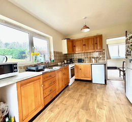 The front lawn wraps around each side of the house and stretches out to form a large grassed area, which in turn leads to the open field which extends to around 2 acres with occasional mature trees. There is a patio stretching the width of the house.