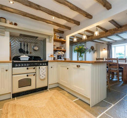 Kitchen - 3.40m x 2.74m - A beautiful country style kitchen with breakfast bar, offering an array of cream shaker wall and base units providing plenty of storage space, contrasting wooden work surfaces, decorative sage green tiling, rustic oak shelving, butler sink with matching chrome mixer tap, space for free standing gas range cooker, stainless steel extractor fan, integrated dishwasher, integrated washing machine/dryer, space for fridge freezer, rear facing glazed window, exposed beams, stone flooring and inset brushed spot lights.