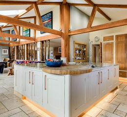 The double height glazed entrance portico opens to an impressive full vaulted reception hall with bespoke staircase to first floor accommodation and a study just off. The hall opens to a large sitting room with feature inglenook-style fireplace with inset wood burning stove. Flowing seamlessly from here is the generous bespoke kitchen/dining/family room with vaulted ceiling incorporating skylights and a virtually glazed elevation allowing maximum natural light into this fabulous family space.