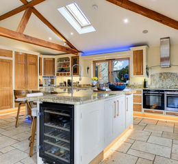 The kitchen area is fitted with handcraft solid wood cabinetry with ample granite working surfaces with matching L-shaped centre island incorporating a breakfast bar plus there is a range of integral high-end appliances and these include: fridge/freezer, dishwasher, induction hob, extractor, four ovens, two warming drawers and a built-in expresso machine. Adjacent to the kitchen is the utility room, fitted with matching cabinetry and space for the usual white goods. Beyond the utility room is a family room/snug and nearby is a secondary staircase which leads to the guest suite with luxury bathroom. From the main staircase, to the galleried landing there are three further double bedrooms with vaulted ceilings and a luxury family bathroom with bath tub and walk-in shower. The master bedroom is an impressive space, again with vaulted ceiling and a wealth of exposed timbers, dressing room and a luxury five-piece bathroom which includes a jacuzzi bath.