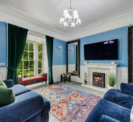Upon arrival, a raised entrance hall welcomes guests with timeless parquet flooring and a sense of grandeur. To either side, two beautifully proportioned reception rooms, the drawing room and formal dining room exude charm and sophistication, each enhanced by either a fireplace or log burner, intricate ceiling cornices and generous bay windows framing picturesque views of the front gardens.