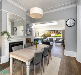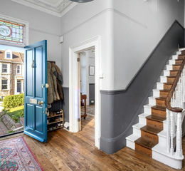 Externally, the house is immaculate in white, bearing the classic plasterwork features of the Victorian era. Terracotta tiles pave the way to a pilastered front door which opens to an elegant entrance hall where the beauty and sheer scale of the house become apparent. Sanded and varnished original floorboards flow along the hall and into the sitting room, while walls are painted in stylish slate below the dado rail, decorating wall panels and skirting boards. High above your head, intricate cornicing runs along the perimeter of superbly high ceilings which can be found throughout this floor.