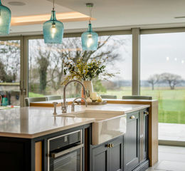 The internal accommodation is centred around an impressive 34 ft open-plan kitchen, dining and living space, forming the heart of the home and oriented to capture uninterrupted south-facing views. The bespoke Studio Wiseman kitchen incorporates oak cabinetry, a one-piece solid stone island, Rangemaster range cooker, Quooker boiling water tap, Neff appliances including dual dishwashers and refrigeration, integrated wine cabinetry, and a fully fitted walk-in pantry plus fully fitted boot room/laundry room. Stone-effect porcelain tiling continues seamlessly from the interior to the external terrace, creating a cohesive indoor-outdoor entertaining space.