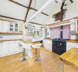 KITCHEN/BREAKFAST ROOM 12' 7" x 12' 10" (3.85m x 3.92m) The kitchen is the real heart of this home and has been updated by the owners to provide a modern finish that while retaining the barn conversion feel. Plenty of natural light fed by the skylights and windows to the front and rear sun room. A breakfast bar, Heritage Stove and traditional butler sink all add to the farmhouse charm. integrated dishwasher. Space for a fridge freezer. Exposed granite walls with wooden beams across the pitched ceiling. Door leading to sun room. Door leading to second hallway.