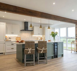 Wooden effect LVT flooring flows out underfoot, whilst the sage green central island hosts ample storage alongside a dishwasher, wine chiller, bin drawer and under-mounted ceramic sink. Further storage can be found in the cabinetry to the walls, with two electric fan ovens, full-length larder fridge and full-length separate freezer, and a five-ring induction hob with overhead extractor.