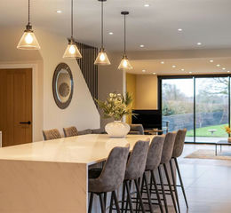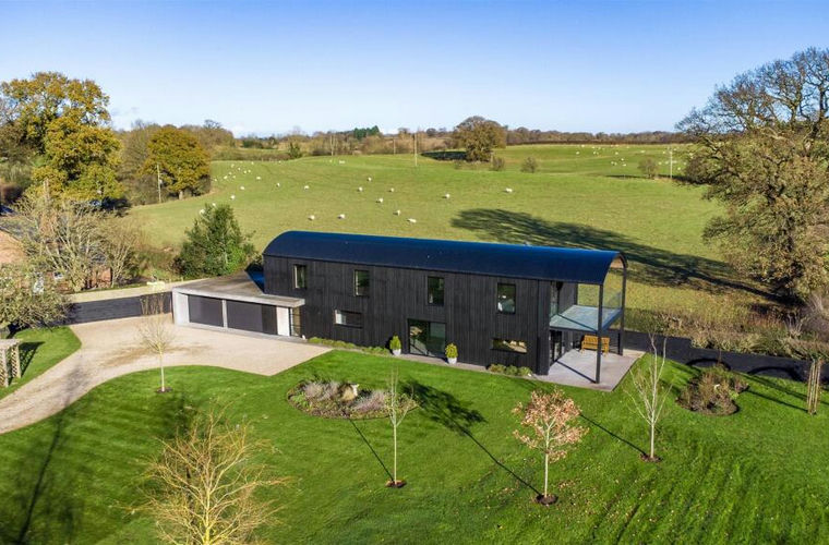 The property is principally accessed via a glazed door which provides a striking contrast against the timber-clad exterior and leads into a wonderful open-plan Kitchen/Dining area boasting tiled floors and a newly installed Kitchen complete with high-specification digitally controlled NEFF appliances, Belfast sinks, Quooker tap; with a door leading into a Cloakroom and a Boot/Utility Room, the latter boasting further access directly from the Garage. The ground floor, which benefits from underfloor heating throughout, gracefully segues from the Kitchen/Dining area into a delightful and versatile Living Area, complete with a Stovax log-burner, which continues the use of natural materials with partly panelled walls and oak-flooring, with the focal point of the room being triple sliding doors with opening panels which offer idyllic views over the manicured gardens and onto the fields beyond.
