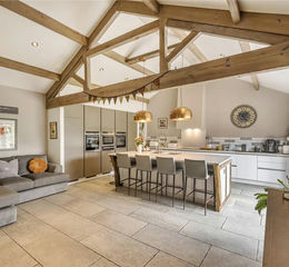 Set over two floors, the property features a stunning open-plan kitchen, with bespoke cabinetry, integrated appliances, and a vaulted ceiling with exposed beams. A central island and casual seating make it the true heart of the home, with an adjoining utility for added convenience.