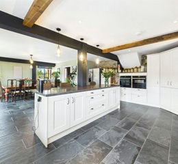 A commanding kitchen and dining space with tiled flooring, wide range of storage units with worktops and tiled splashbacks over, inset one and a half bowl composite sink and drainer with a Swan neck style tap over, well positioned under a timber framed double glazed window, inset five burner gas hob with extraction hood over, a super kitchen island with a breakfast bar feature, a dual eye-level oven and grill, radiators, two timber framed double glazed windows, timber framed double glazed patio door leading to the private and enclosed rear garden, exposed timber beam features, exposed brickwork wall, ceiling lights, ceiling spotlights, door leading to utility room.