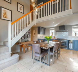 The property is entered via a central glazed door in the original barn opening to the dining kitchen. This, with additional glazing around the door provides spectacular views with the additional drama of a double height ceiling, with exposed roof trusses over part of the kitchen area. The kitchen is fitted with a good range of hand painted in frame units with granite worksurfaces and a Falcon range style cooker with induction hob.