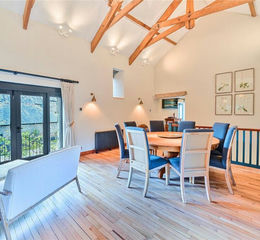 First Floor. The grand reception room is a truly impressive space, not just in length but in height too, with a vaulted ceiling of exposed timbers, dual aspect, with external stairs to the front to the property and a charming balcony - perfect for morning coffees. A feature wall of bespoke shelving and a RIAS Viva wood burner, works extremely well with the Lutron lighting zones creating wonderful ambient moods. At the south-east end of the first floor is a charming snug, known as "The Whisky Room" a triple aspect room for those quieter winter evenings, previously used as an additional bedroom. The kitchen is at the opposite wing of this floor, an exceptionally stylish array of matching base and wall units with a Bertazzoni dual fuel Heritage Range Cooker, triple aspect and stairs leading up from the front of the property.